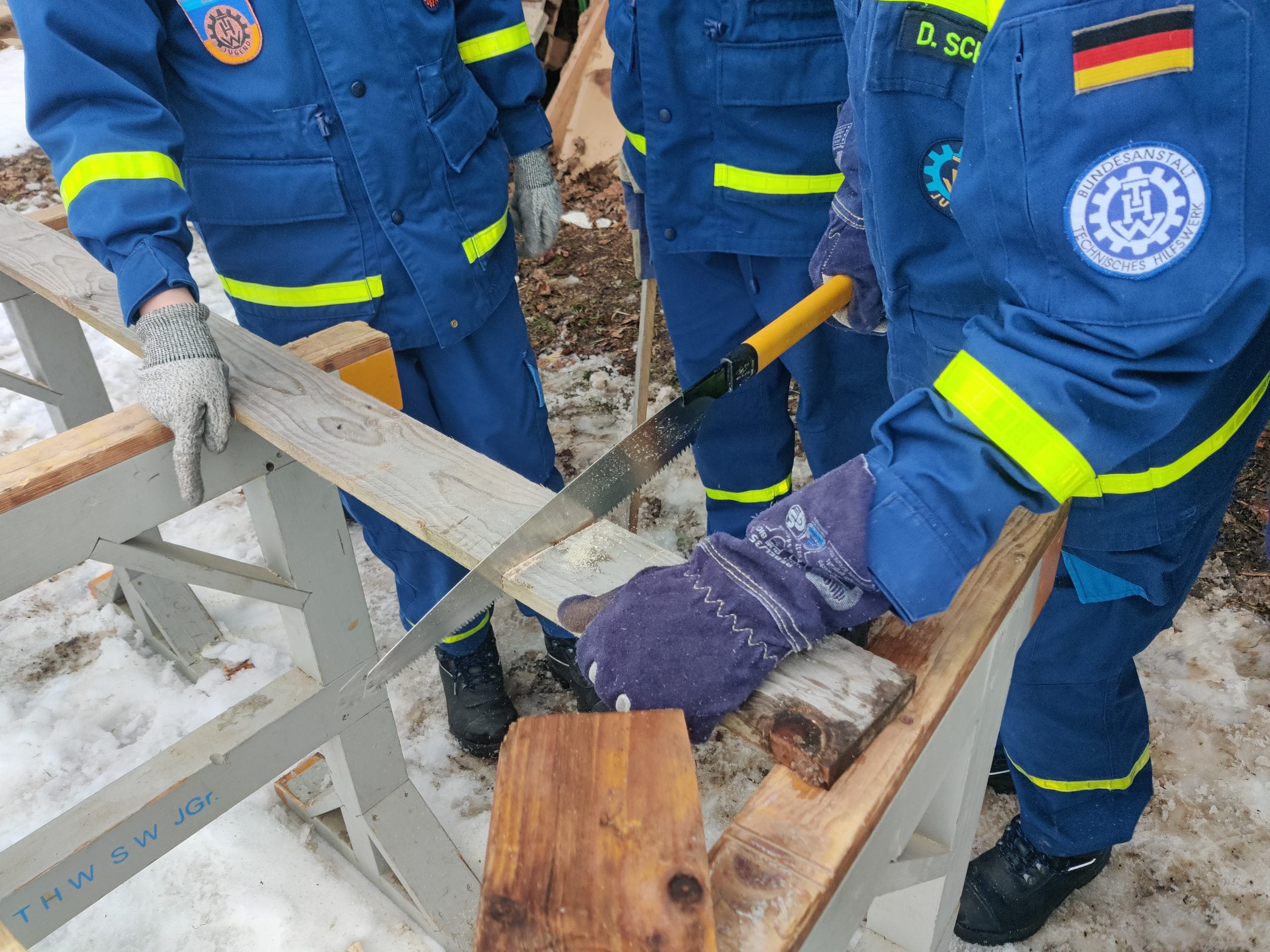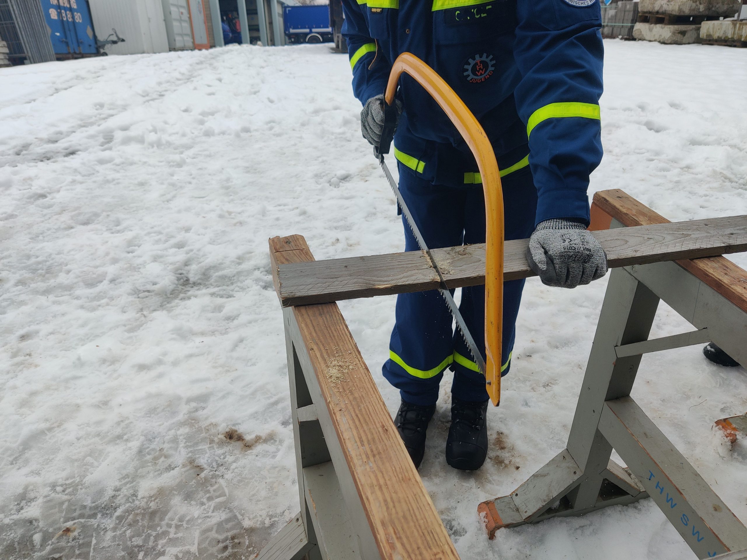 Zum Aufwärmen haben wir in der Unterkunft unser Gedächtnis- und unsere Kommunikationsfähigkeiten mit Zahlenkärtchen trainiert um dann nochmal richtig handfest nach draußen zum Ablängen eines Holzstückes zu gehen.